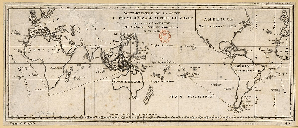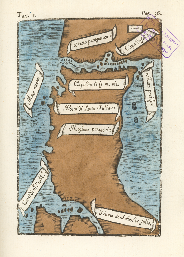 ![]() The first circumnavigation of the globe was the voyage of 1519-22 by the Portuguese navigator Ferdinand Magellan (1480-1521), undertaken in the service of Spain. The only known first-hand account of the voyage is the journal by Venetian nobleman and scholar Antonio Pigafetta (circa 1480-1534). Four manuscript versions of Pigafetta’s journal survive, three in French and one in Italian. Pigafetta also made 23 beautiful, hand-drawn color maps, a complete set of which accompanies each of the manuscripts. Shown here is Pigafetta’s map of the Strait of Magellan, as reproduced in Carlo Amoretti’s 1800 edition of the only Pigafetta manuscript in ltalian. Amoretti (1741-1816) was an Italian priest, writer, scholar, and scientist, who, as a conservator at the Biblioteca Ambrosiana in Milan, discovered the manuscript, which was long thought to be lost. Amoretti published the Italian text with notes in 1800, and a French translation the following year. The map depicts the southern part of South America, including the Strait of Magellan, discovered on the voyage. Discovery and exploration; Magellan, Strait of (Chile and Argentina); Tierra del Fuego (Argentina and Chile). |