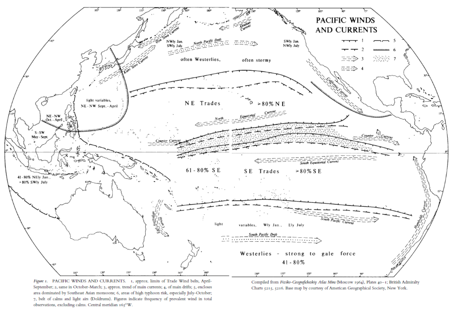 The map titled "PACIFIC WINDS AND CURRENTS" provides a geographic representation of the wind patterns and ocean currents in the Pacific Ocean, illustrating trade wind belts, prevailing oceanic drifts, typhoon-prone areas, and seasonal variations in atmospheric circulation.