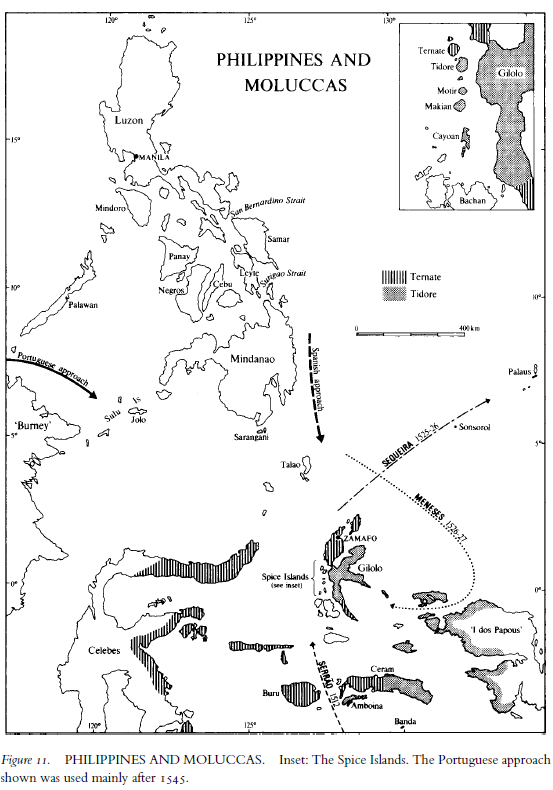 The map, titled "PHILIPPINES AND MOLUCCAS," provides a geographic depiction of the Philippines and the Spice Islands (Moluccas), focusing on the competing Spanish and Portuguese claims over the region. The inset map details the key islands of the Moluccas, including Ternate and Tidore, which were central to the spice trade.