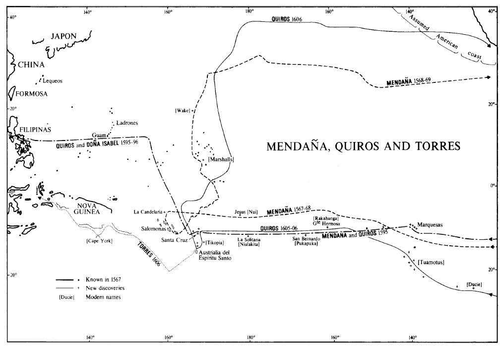 The map depicts various voyages, including those of Mendaña (1568-69, 1595), Quiros (1605-06), and Torres (1606). These expeditions contributed to the European discovery of several islands in the Pacific, such as the Marquesas, Solomons, Santa Cruz, and Espiritu Santo.