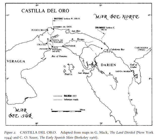 - Explorers’ Routes: The furthest west reached by Rodrigo de Bastidas (1500-1501) and the furthest east reached by Christopher Columbus (1502-1503) are marked, showing the extent of early Spanish navigation in the region.