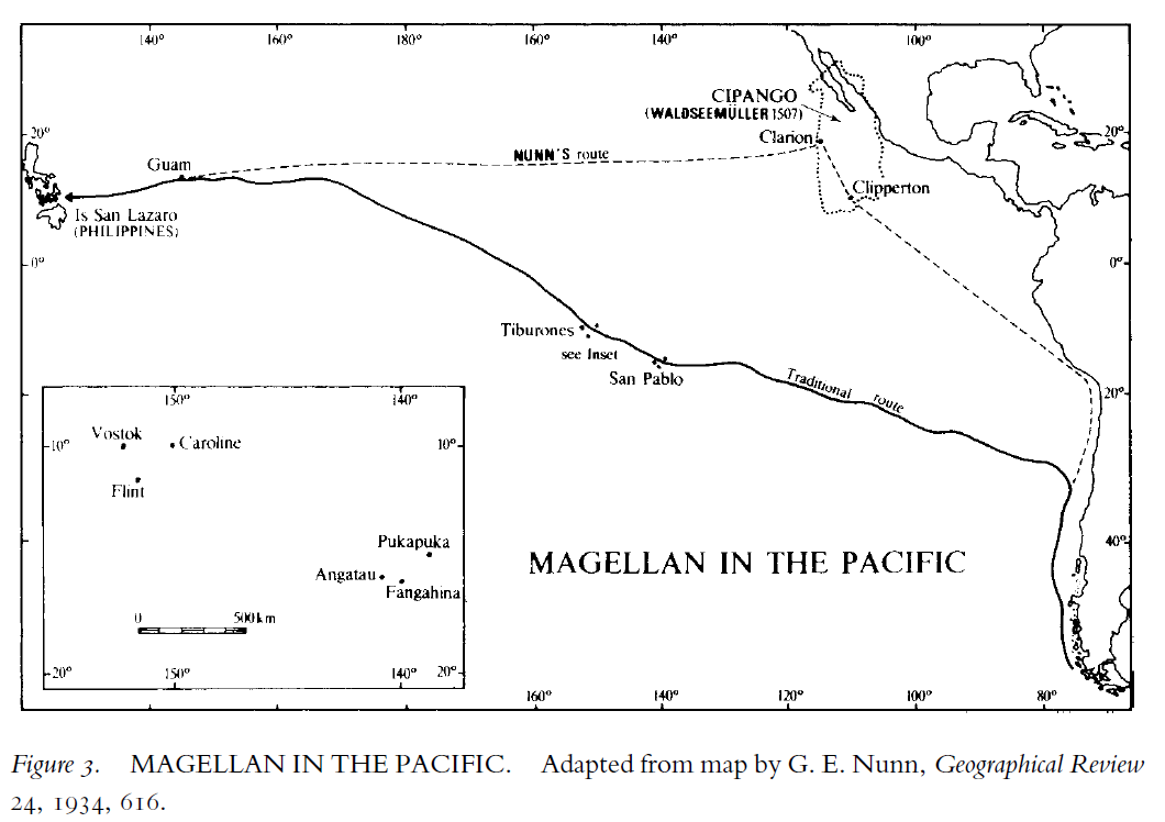The map in the image is titled "MAGELLAN IN THE PACIFIC" and is adapted from a map by G. E. Nunn, originally published in the Geographical Review, Volume 24, in the year 1934, on page 616.