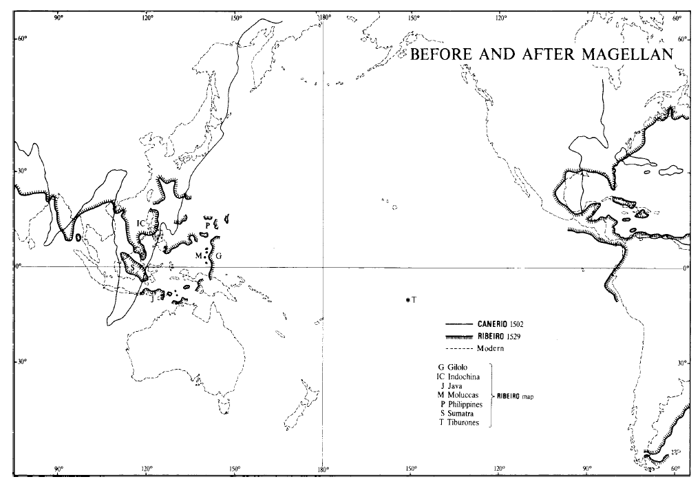 The map is based on historical cartography, featuring sources such as Canerio's 1502 map and Ribeiro's 1529 map, contrasted with modern geographical boundaries. Canerio's map represents early European perceptions of maritime routes and landmasses before Magellan's circumnavigation, while Ribeiro's map reflects knowledge gained from subsequent explorations, including the more accurate placement of the Philippines, Moluccas, and surrounding islands. The comparison underscores the evolution of geographic understanding in the Age of Exploration, illustrating how early maps contained distortions that were progressively corrected through navigational discoveries. Key locations such as Gilolo, Java, Sumatra, and Indochina are marked, showing their significance in early European exploration efforts. The map serves as a historical reference for the impact of Magellan’s voyage on world mapping.