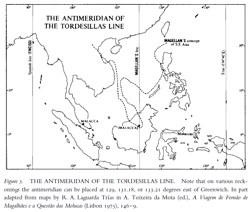 The map titled "THE ANTIMERIDIAN OF THE TORDESILLAS LINE" illustrates the division of the world between Spain and Portugal as defined by the Treaty of Tordesillas, with a focus on its antimeridian, which determined territorial claims in the East.