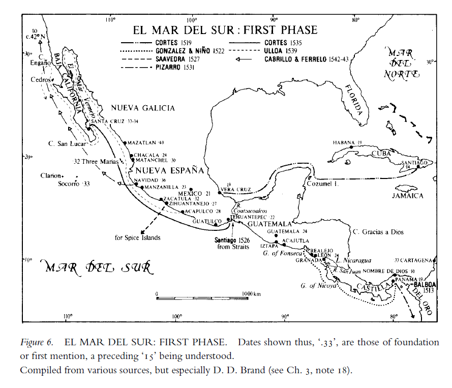 Key locations such as Veracruz, Acapulco, Panama, and Balboa's 1513 expedition to the Pacific are marked, showcasing the importance of these areas in Spain’s strategy for Pacific exploration and expansion.